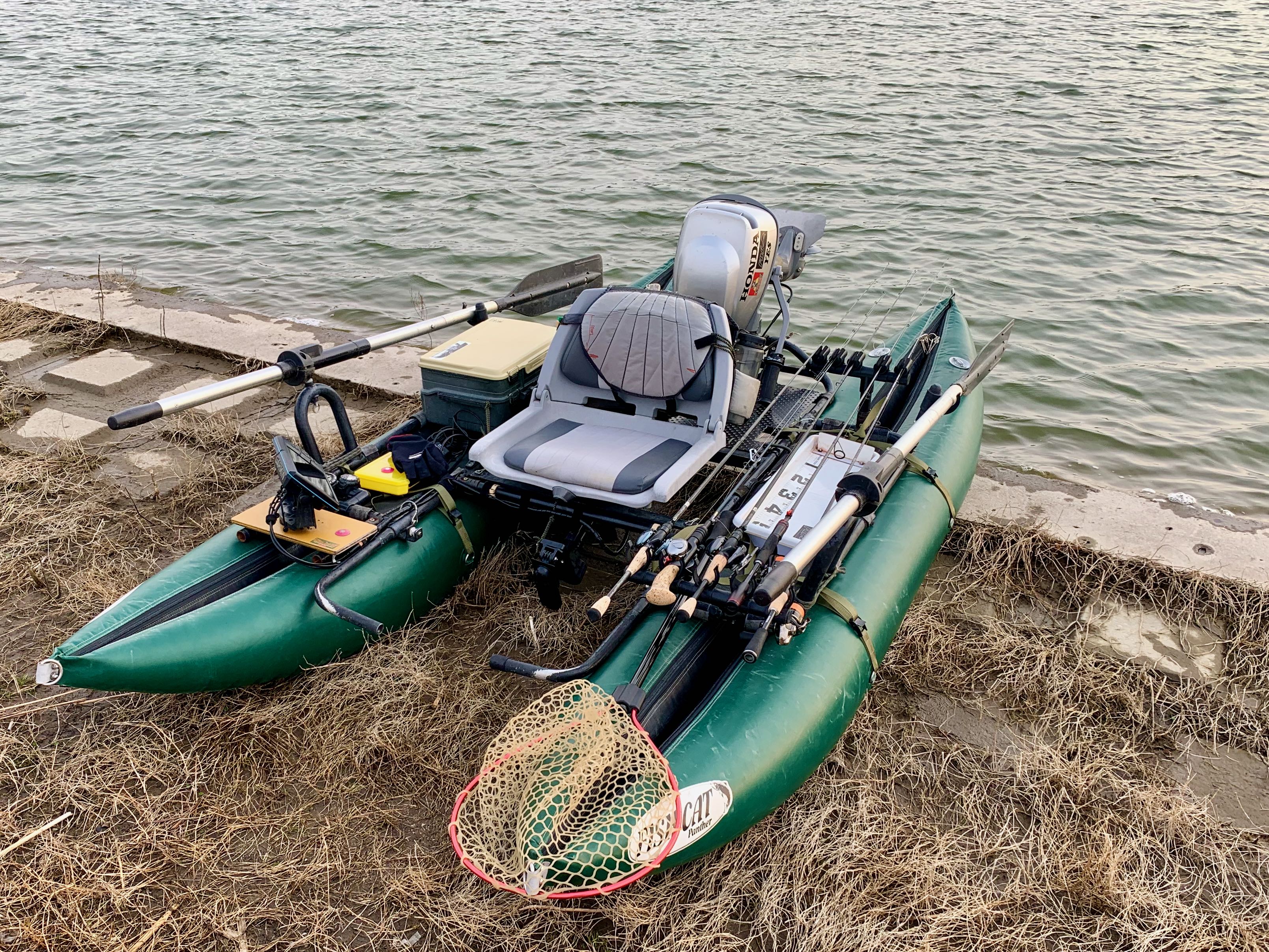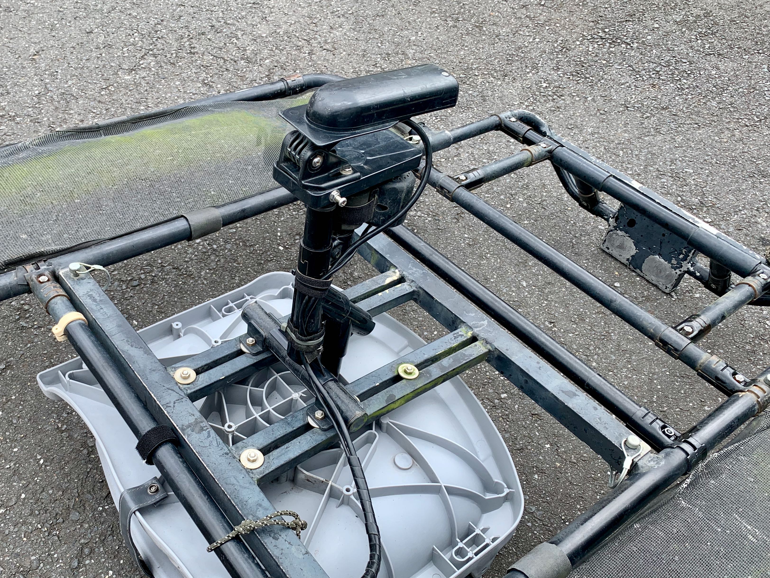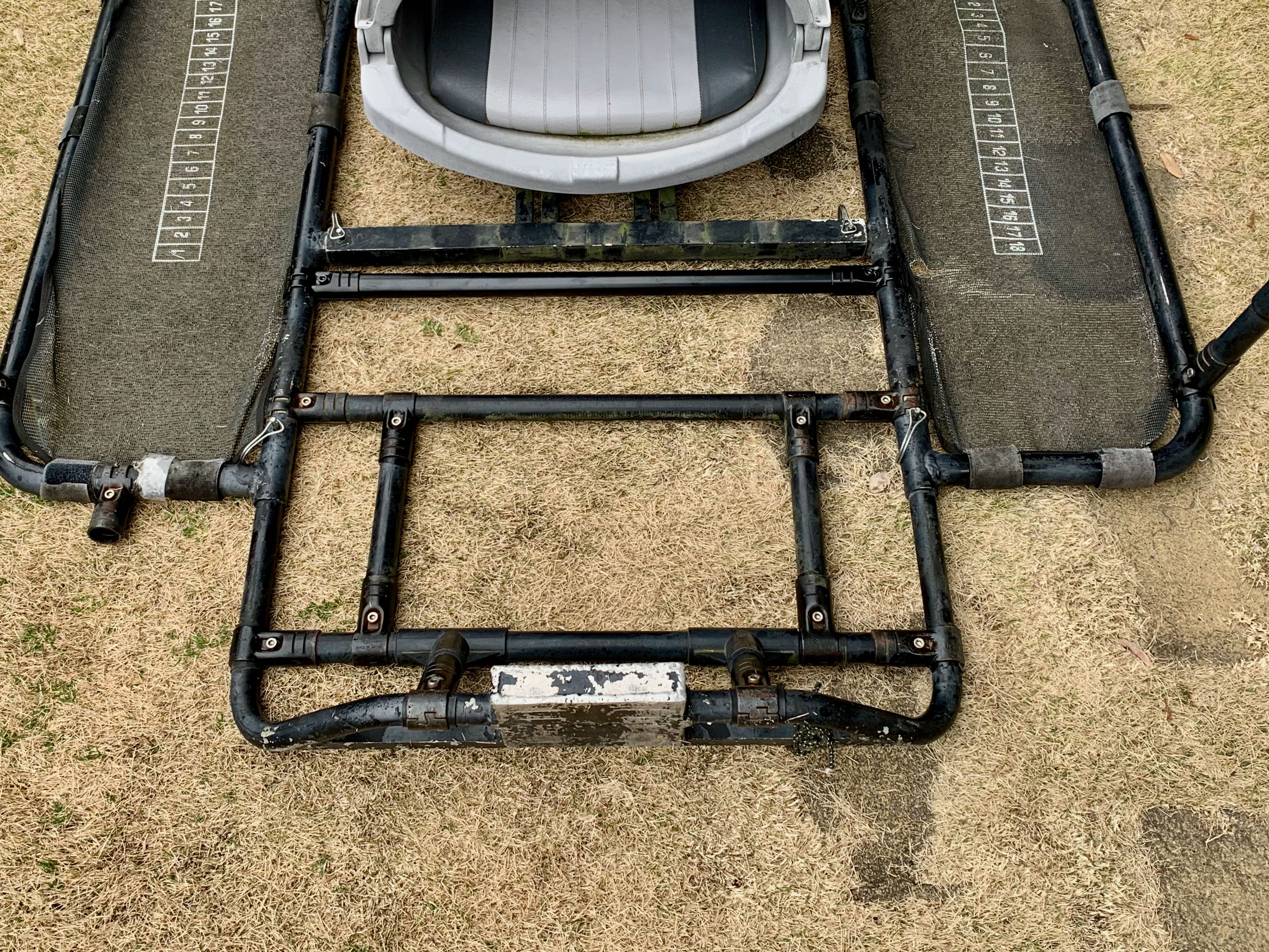 ご無沙汰していますサムライです。2025シーズンに向けて実施したポンツーンの改修について報告します。ポンツーンフレーム類は購入した 2012年から10年以上、浮力体は交換後 5年以上使用しているので、あちこち不具合がでています。今回は浮力体へのバンパーシート貼り付けと、リアデッキ部分のネットの置き換えと、魚探振動子ステー交換 を実施しました。