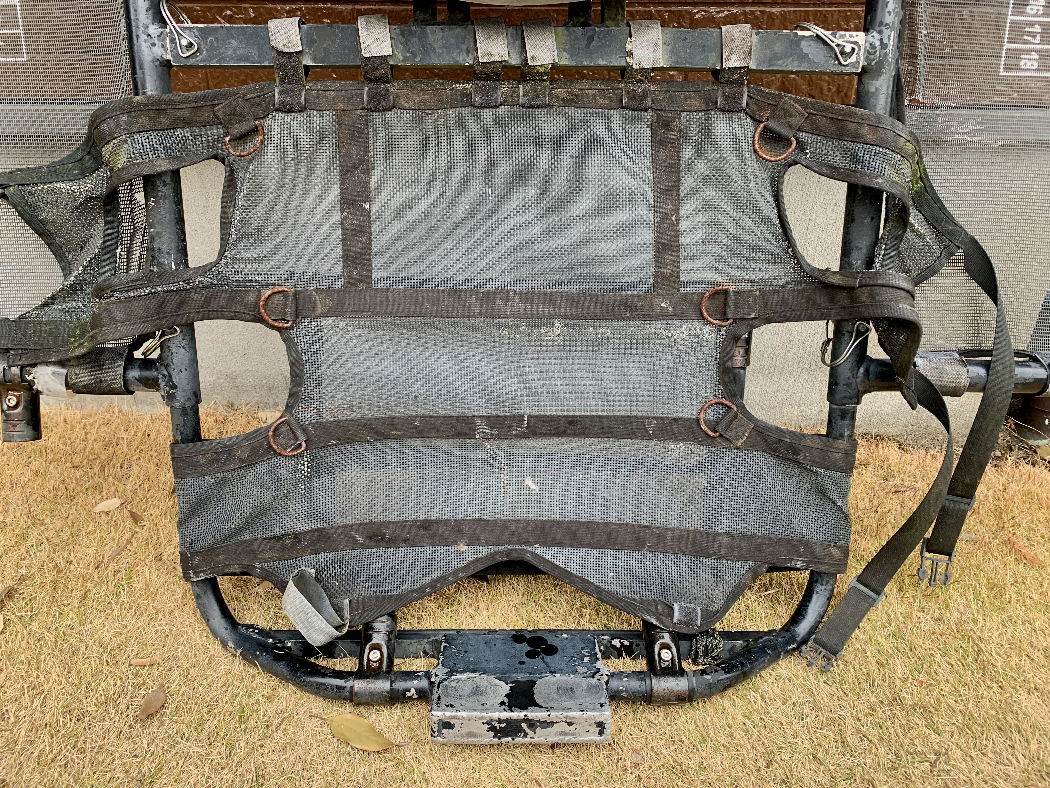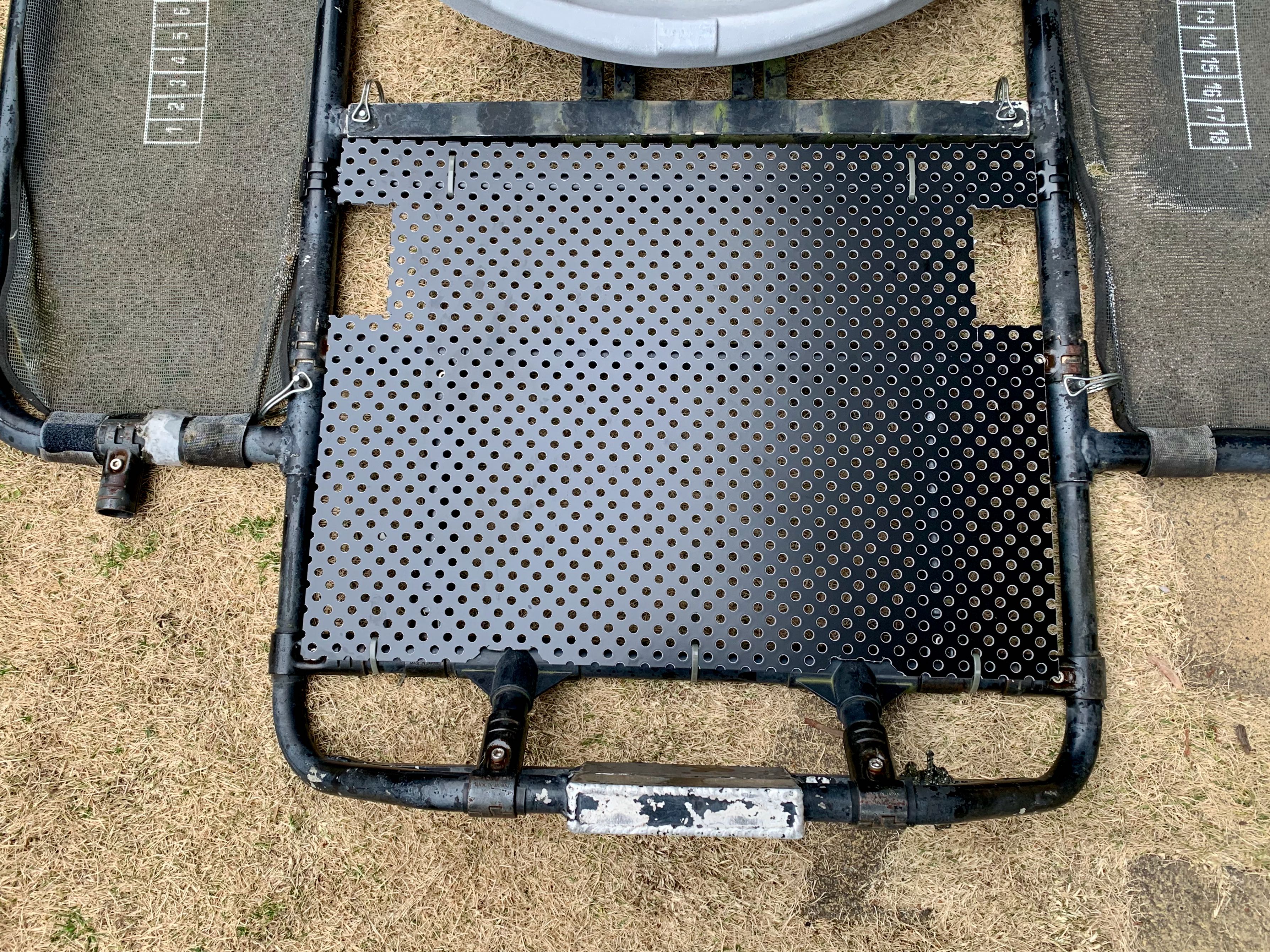 こちらも3〜4年使用しており、クイや岩に何度かぶち当てています。とうとう折りたたむ為の可動部イレクタージョイントが折れてしまいました。仕様については不具合等は感じていなかった為、全く同じものをイレクターで作り直しています。シートの真下に設置しています。