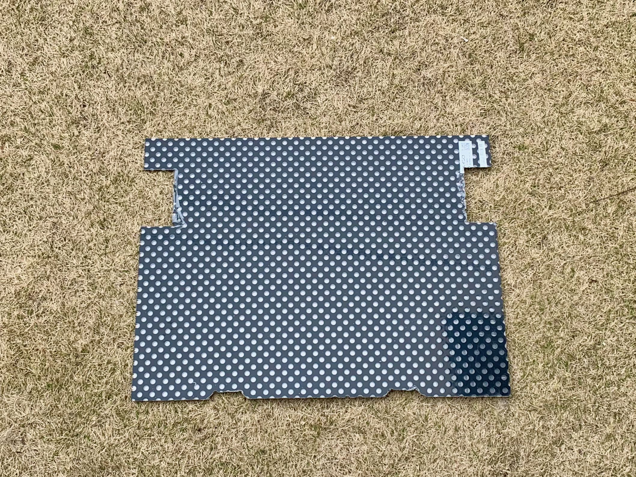 10年以上使用し、紫外線や風雨にさらされてきたリアデッキ。ネット状の材質でつくられていましたが、部分的に傷みがはげしいので、アルミ複合材のプレートに置き換えることにしました。本来はアルミ板としたいところでしたが、予算と重量と加工性の問題から断念しています。