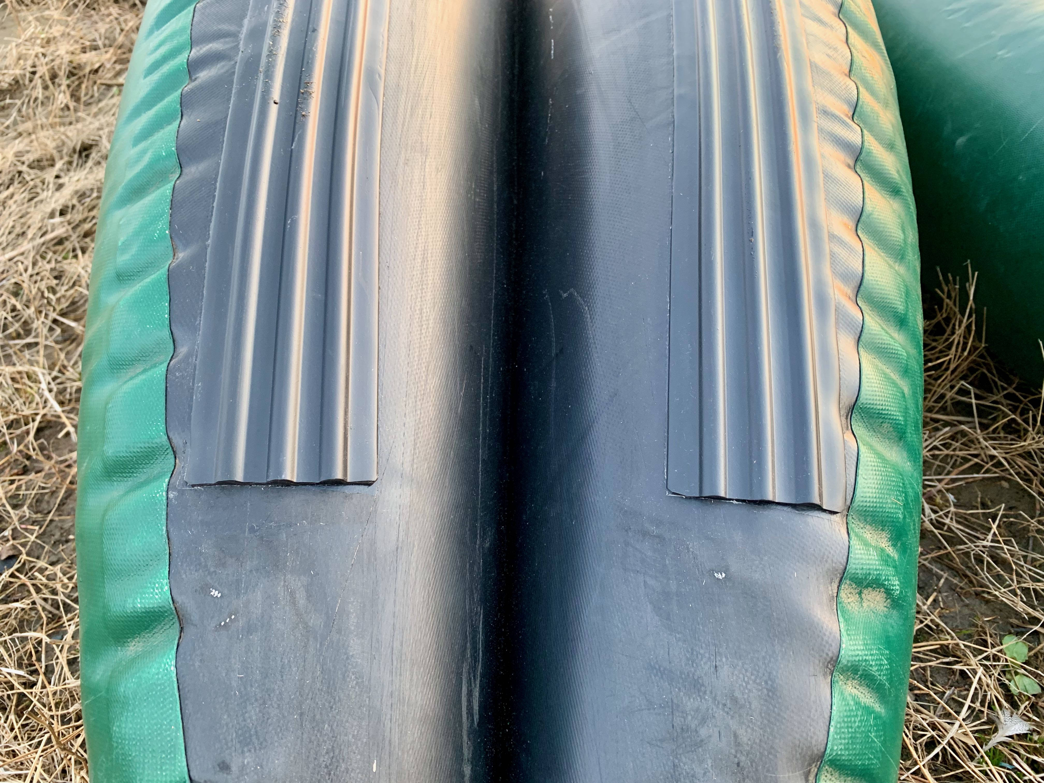 5年以上使用していると浮力体底面がだいぶ擦り切れてきます。サムライ艇は FishCat社 Panter9 というモデルで一応 5年保証にはなっています。生地の厚さは 1000PVC ということなので、分厚いという意味だとは思いますが、250回以上使用すると穴も空いてきます。小さな穴の部分は内側から耐水テープで補強をしています。今回はその道のプロでもある Bee社に依頼してバンパーシートを貼ってもらいました。