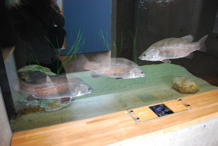 ニジマスやイワナももちろんラージマウスバスやスモールマウスバスも展示してます。1m越えのイトウもいるけど、やっぱ目玉は写真のアカメでしょうかね。