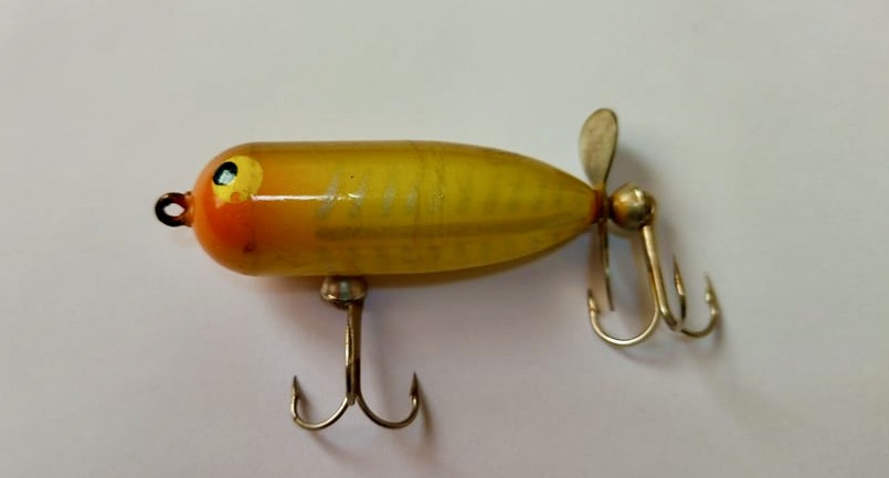 見た目どおり、ヘドンのトーピードのもろパクリ。違いは ラトルが入っているのとペラの大きさ。当時はコレをスピニング投げていましたが、動かし方も何も判らず棒引きをすれば くるくるとルアーごと回転して糸ヨレを作り、ちょんちょんと引いても?