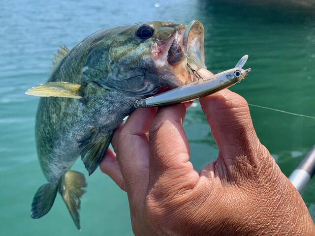 魚券買って、エントリーカード入れたら、ようやく大名出勤でスタート。まずは岬沖のストラクチャからチェック。いきなりラッシュかかるけど、ムラっ気あるわ、どうやらサカナ