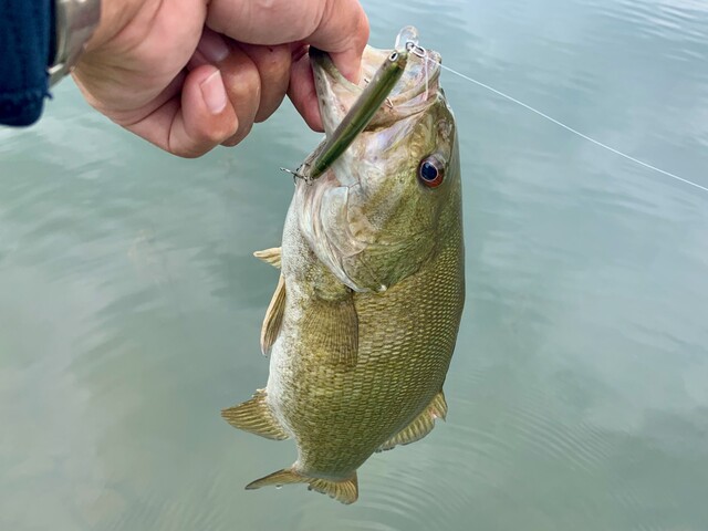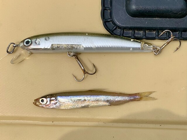 が2歳魚のワカサギ食ってたよ。このサイズだと K-I ミノーでしょ。