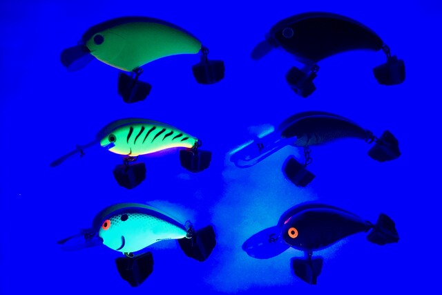 釣り人にとってあまり嬉しくない紫外線ですが、紫外線ライトを使うと、だいぶ違う世界が見えてきます。 そう!蛍光色が輝く(蛍光色は目立つというより、紫外線でひかっている)んですよ。水中では水深が深くなるほど色調の成分が減衰してゆきますが、紫外線で輝く蛍光色はあまり影響を受けません。さらに水中の光は横方向には広がり辛いので、蛍光色のルアーを積極的に使うことで紫外線を味方にすることができると思っています。マズメ時や曇天などの可視光が少ないときでも、紫外線は降り注いでいます。そんな時は意図的に・・・