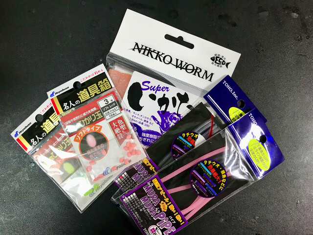 ここ数年、美味しい肴を食べたい一心で海釣りにも出かけています。当然仕掛けも自作するようになってくると、海用グッズがバスに効きそうな気がしてきます。蛍光色のバリエーションも多いし、蓄光(=夜光:蛍光と違って遅れてひかりだす)や強烈なフラッシャーもあります。そして素材の異なる魅惑のワームも・・・ さて吉とでるか凶とでるか?