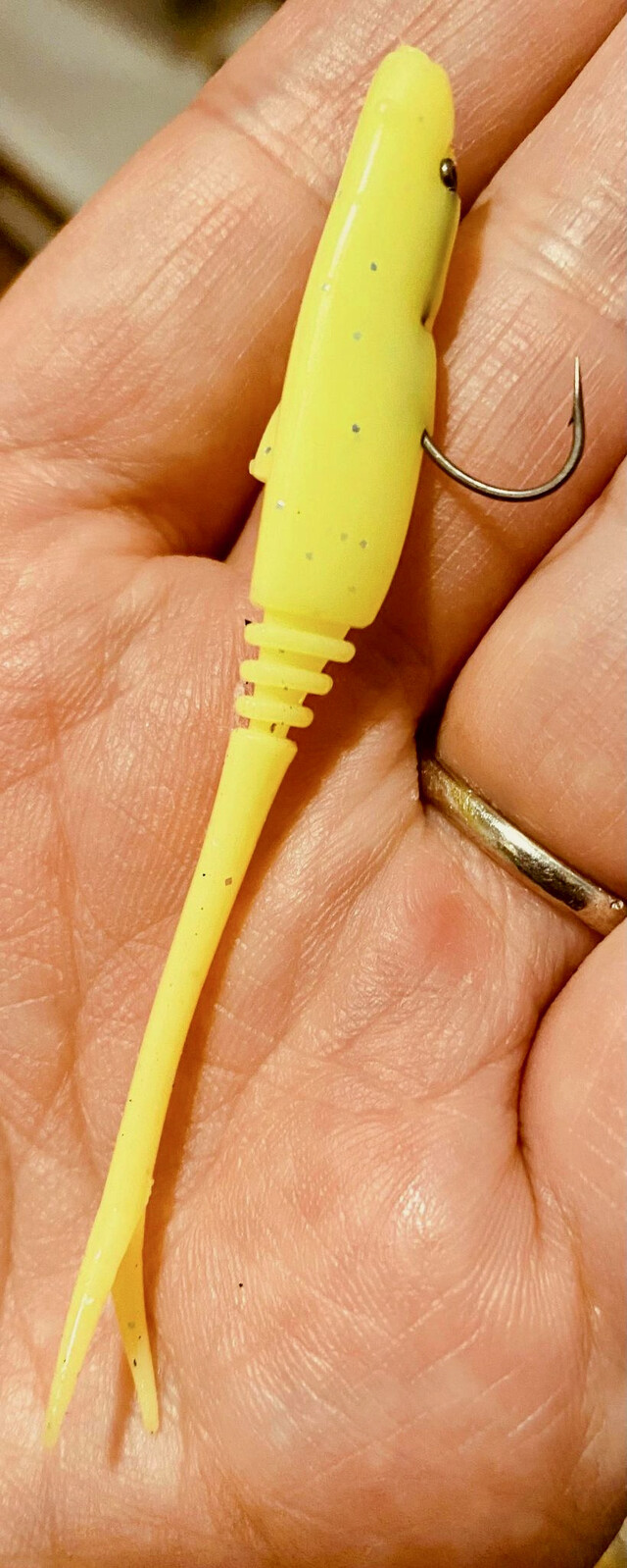 小生の場合、色は視認性を重視してイエローを使います。使用するフックはリューギのフォグショット#4。フックは腹抜き派なので、一度頭から抜いて腹に縫刺ししています。