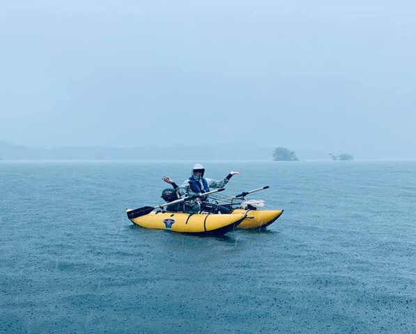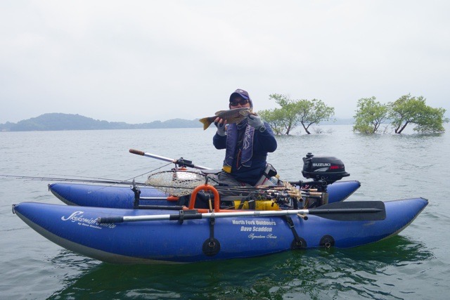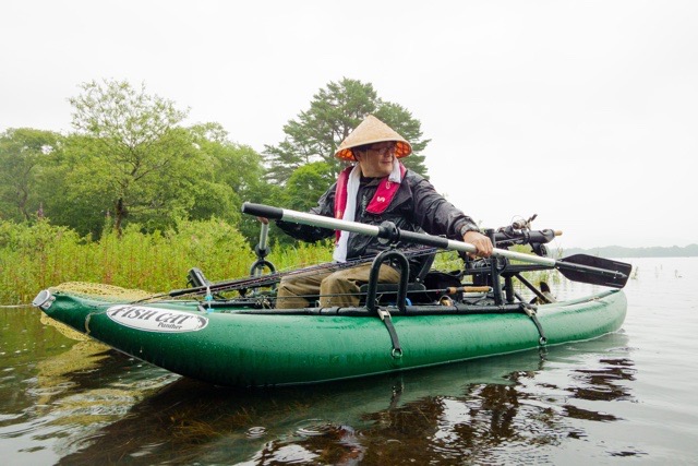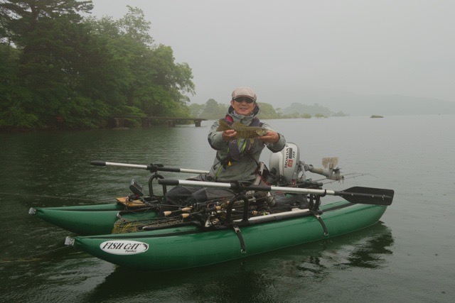 初日は雨まじりの1日。まずはここ数年、安定感抜群の仏頂面氏。なんでもBEE社製エアバードに乗り換えてから、集中して釣りができるようになったとのこと。いいフローターに巡り合ったようですね。噂によるとロッドホルダー開発にも参加している様子。今回もいきなり魅せてくれました。