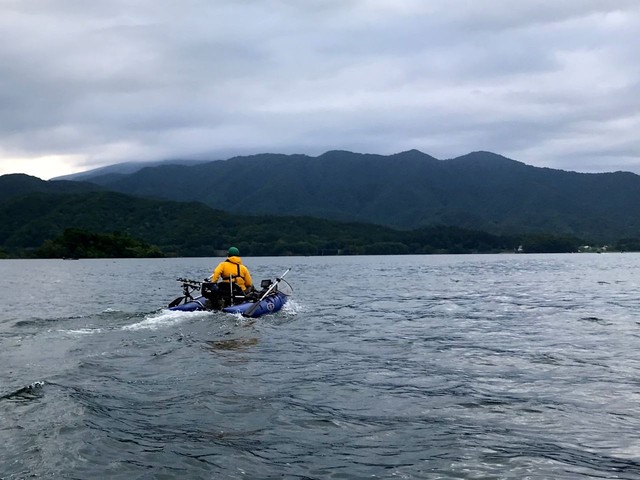 しかしフローターでこれをやると、クルクル回転しがちで、一方向に定りません。仕方ない。360度適当にキャストしながらドテラ流ししよう。少し沖へ出て(岸から100m以上離れても水深が1.5m以下しかない遠浅エリアの風上を目指して)、そこから漂いながら360度キャスト。接岸したらまたオールで風上へ戻る。その繰り返し。