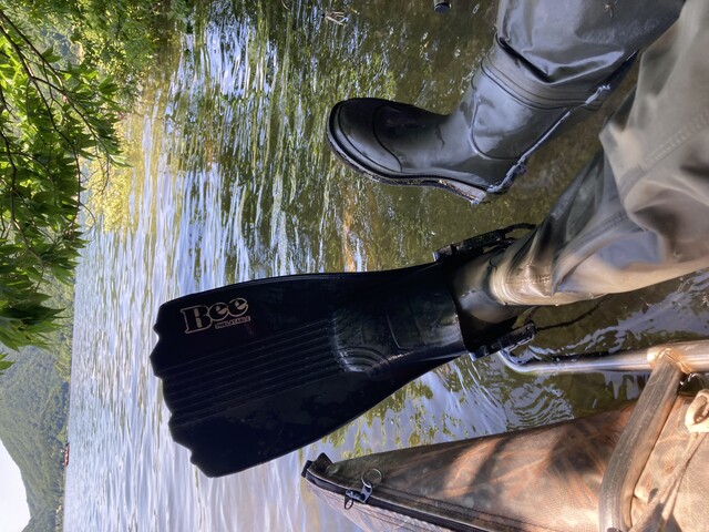 この日、桧原湖は朝9時過ぎ頃から風が吹き出し、湖面の様子が変わってきました。私はその頃、違う釣り方を試みたり移動を繰り返したりしていたのですが、この時、うっかりフローターフィンの右足を湖底に落としてしまいました。