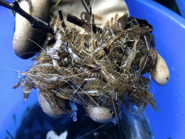 その2、ウイードのあるストレッチをダダ流ししていると今度は人の声。仙人風のヒトがスロープを降りて来てショアのブッシュでガサガサを始めました。覗きに行くとエビを穫っているとのこと、ナマでも揚げても美味しいというので、ホントにそのままつまんでみました。醤油かポン酢があれば確かに美味ですよ。仙人によると例年は6月で減水するのでエビは終わり。今年は水が多いのでまだガサガサでエビが穫れるとのこと。