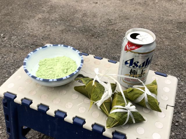 夕方、お二方が帰った後、キャンプ場のおばちゃんからチマキの差し入れがありました。3個だったので、お二方のぶんも頂いておきました。手作りチマキ、美味しかったです。この場をお借りして御礼と報告とさせて頂きます。