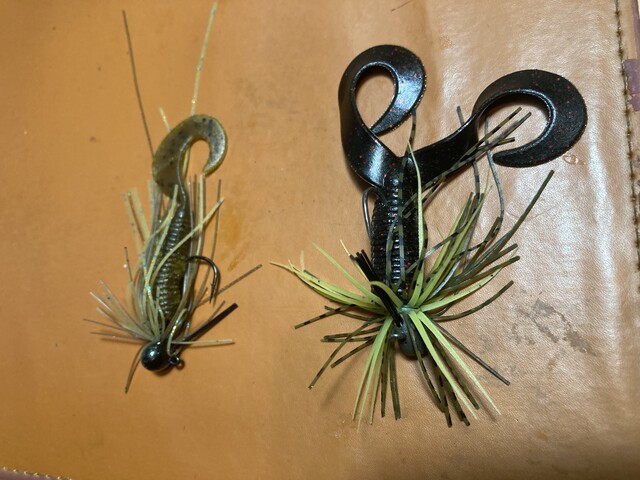 スモラバの銘柄には特にこだわらず、1-2本のブラシガードがついていて、スカートがやや長めで、フックがやや大きめで、重さが1.8-3.5gであれば何でもOKでした。トレーラーは「甲殻類」「存在感」を意識して、ゲーリー3インチグラブや、4インチダブルテールを寸詰まりにした物などを多用。パッと見せて、パッと喰わすようなイメージです。あまりモタモタ時間を使いません。