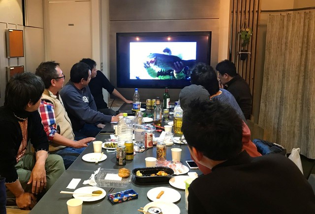 議事が終わると、当然のごとく宴会になります。飲みながらではありますが、琵琶湖スペシャリスト プロフェッサーO氏によるビックフィッシュ研修の一コマです。ああっ春が待ちどうしい! 2019年もFBIは熱い一年になりそうです。